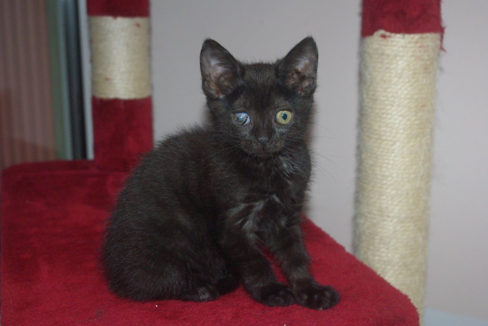 Lucy und ihre Geschwister stammen von der netten Mutterkatze Hope ab. Leider hatten sich die Welpen mit dem Katzenschnupfenvirus infiziert, bevor überhaupt ihre Augen geöffnet waren. Sie haben alles gut überstanden; nur Lucy hat eine Trübung auf ihrem rechten Auge davongetragen, die sie aber nicht weiter beeinträchtigt.